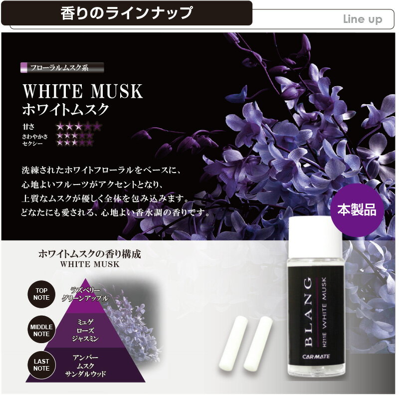 ホワイトムスクの香り構成 トップノート ラズベリー グリーンアップル ミドルノート ミュゲ ローズ ジャスミン ラストノート アンバー ムスク サンドルウッド ブラングは、クルマとの調和を重視した香りを探求し、上質で洗練されたフレグランスを創出しています。